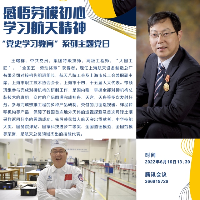 2022年6月16日,永利yl23411永利yl23411教师党支部在线上举行“党史学习教育”系列主题党日活动。本次活动主题为“感悟劳模初心,学习航天精神”,永利yl23411全体教师党员参加,部分员工党员列席旁听。本次主题党日活动邀请的主讲人是 “全国五一劳动奖章”获得者、大国工匠、全国劳模,高级工程师、集团特级技师,上海航天设备制造总厂有限公司对接机构组班组长,航天八院工会及上海市总工会兼职副主席,上海市职工技术协会会长,上海市十四、十五届人大代表王曙群工程师。
