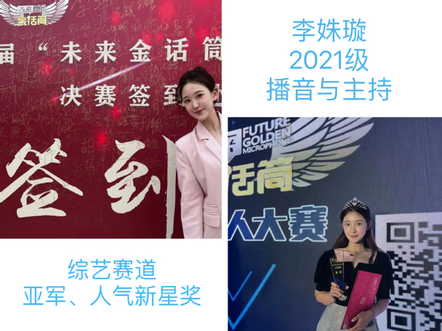 很荣幸也很幸运获得了江苏广电·未来金话筒全国主持人大赛综艺赛道的亚军。从最开始的四千多人一直走到现在,看到了许多许多优秀的选手,站在舞台上手握话筒的时候也更加坚定的要在这条道路上越走越远。这个亚军也是对我最大的肯定和鼓励,我也一直相信我会保持着热爱与真诚继续手握话筒一年又一年。以后走的每一步路都会脚踏实地。