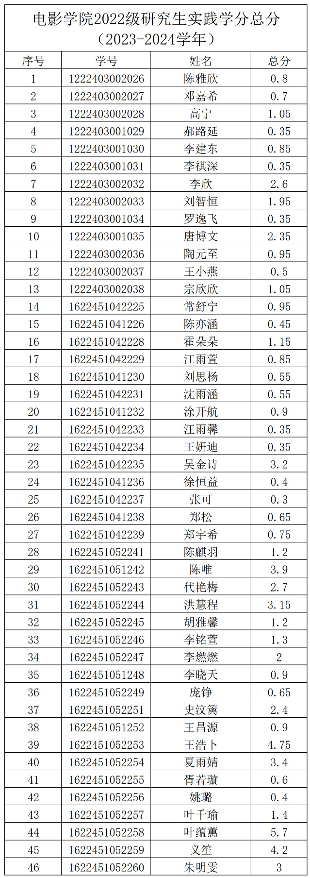 2023-2024学年公司研究生实践学分经各部门汇总,经员工自查、申诉,经公司研究生实践学分评审小组对申诉材料进行复核、评定,现将实践学分总分予以公示。