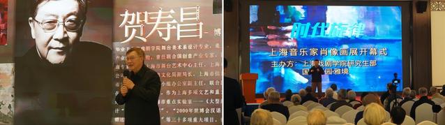 画展展出了贺寿昌教授创作的一组上海音乐家画像,以上海音乐界代表人物为创作对象,在大量采访、调研的基础上,结合每位音乐家的人生经历,创作出各具特色的肖像画,最终以色彩与旋律融合的形式,讲述音乐家的“上海故事”。同学们也发挥专业所长,以主持和摄影摄像的方式参与到了画展开幕式当中。