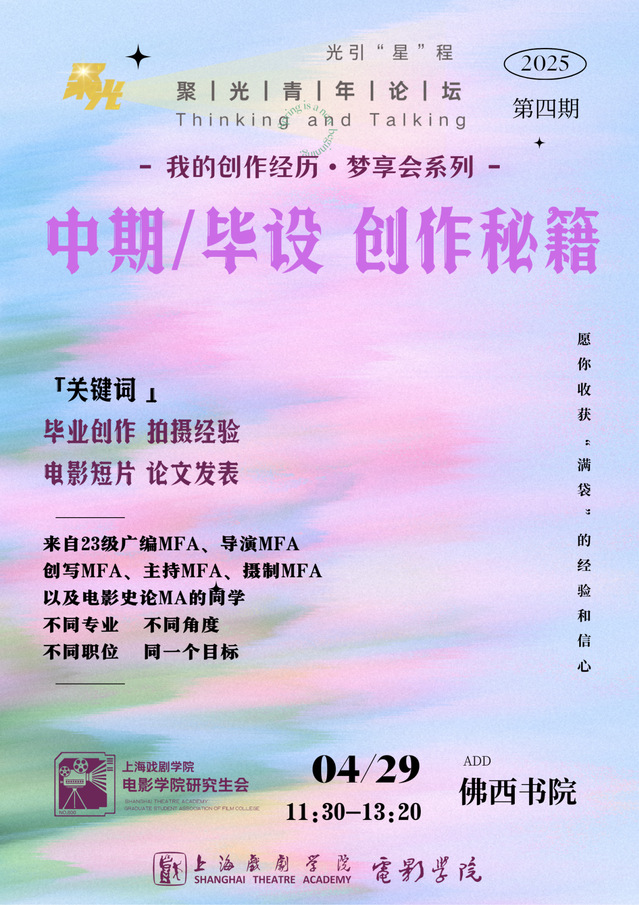 4月29日,由公司研究生会主办的“聚光青年论坛·第四期:中期创作分享会”在佛西书院顺利举行。活动由2024级主持艺术MFA的廖玉琳同学主持。