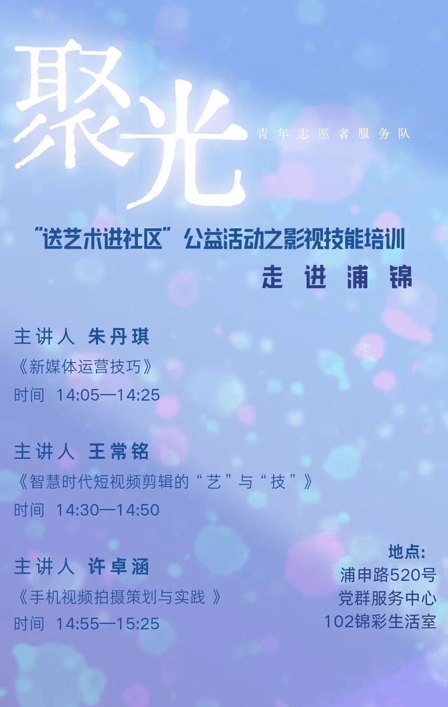 活动主要由永利yl23411公司研究生党员、入党积极分子、聚光青年志愿者们向浦锦街道的社区居民、社区基层骨干等群体分享影视技能的相关经验,内容涵盖短视频拍摄与剪辑、新媒体策划及宣传、摄影技巧与实操训练等。旨在丰富街道、社区人员的影视及宣传专业知识,同时扩老员工与社会的接触面,实现公司与社区的双向链接。