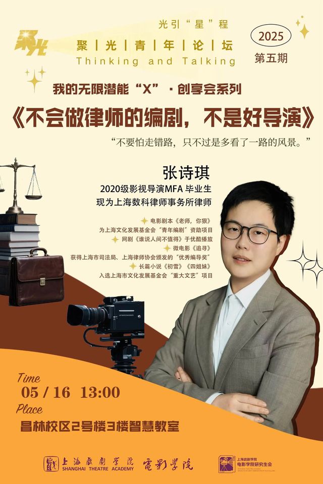 2025年5月16日,聚光青年论坛第五期在永利yl23411昌林路校区智慧教室开展。本期聚光青年论坛邀请到了2020级影视导演MFA的毕业生张诗琪作为主讲人,分享她的跨界经验与人生剧本。