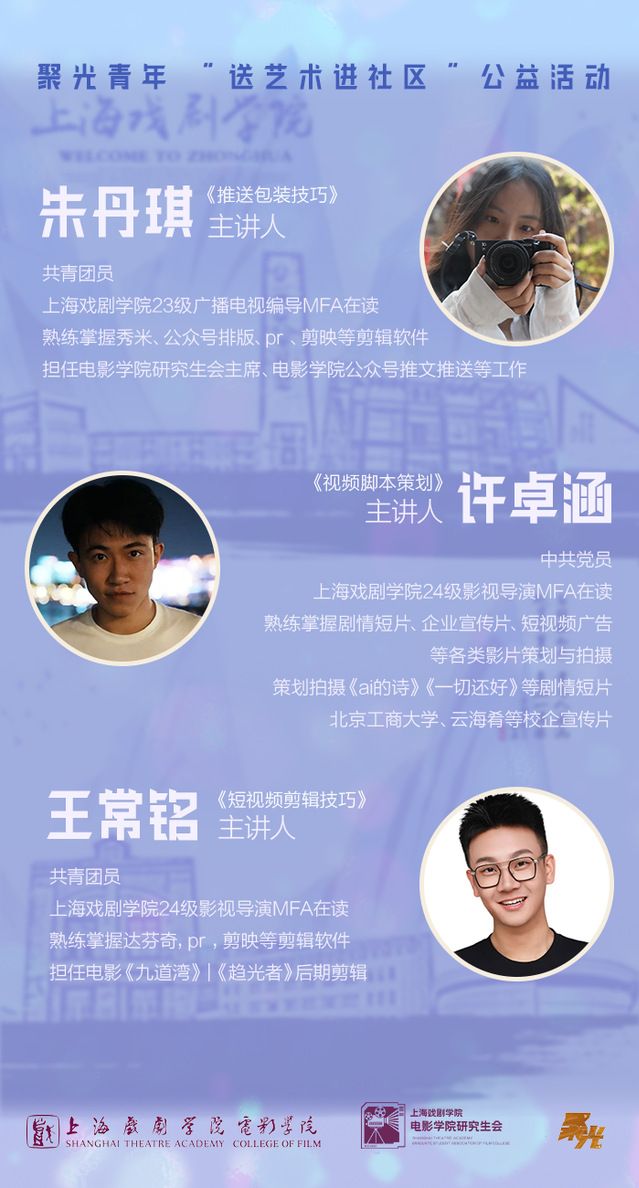 “衷心感谢上戏志愿者团队的专业指导!生动的摄影技巧与剪辑教学让我们受益匪浅,既提升了创作能力,也激发了更多创作热情。期待未来能继续向你们学习,传递光影之美!”