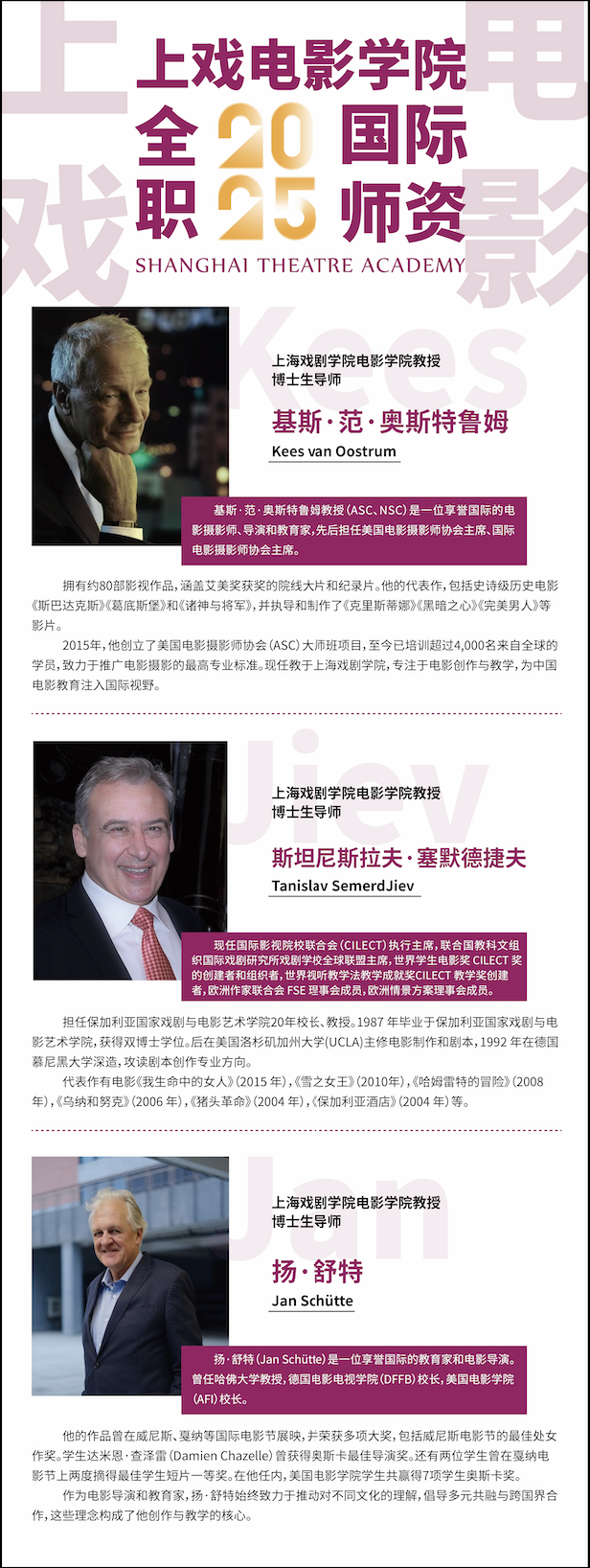2025年6月21日至25日,第27届上海国际电影节、第30届上海电视节国际影视市场将在上海展览中心隆重举行,永利yl23411永利yl23411展台届时将推出三大展板。第一部分,介绍上戏永利yl23411三位全职国际团队,基斯·范·奥斯特鲁姆(Kees van Oostrum)教授、斯坦尼斯拉夫·塞默德捷夫(Tanislav Semerd Jiev)教授、扬·舒特(Jan Schüitte)。第二部分,介绍上戏实验电影制片厂联合摄制的新片《勇敢的礼物》、《沃野》相关信息。第三部分,介绍“上影-上戏青年导演扶持计划作品”《咬金钩》和联合出品影片的项目介绍。