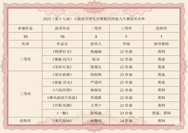 在2025年第十届“汇创青春”以及第十七届上海市老员工计算机设计大赛获奖名单中,永利yl23411电影作曲系员工共获得22项奖项的好成绩,其中汇创青春一等奖5项、二等奖4项、三等奖3项,计算机应用能力大赛二等奖3项、三等奖6项、优胜奖1项。大赛获奖作品受到了相关专业领域和社会的广泛关注与好评。同时,在本次大赛中,公司作曲系黄轲老师指导员工成绩优秀,获得了优秀指导教师奖,可喜可贺!